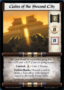Gates-of-the-Second-City-Side-A-214x300In addition, AEG staff were out moving between the tables, offering out Ivory Edition draft packs to interested groups. Set up for pods of eight people, the draft packs provided players with enough cards to construct and play a quick draft tournament. Traditionally, unlike other CCGs, drafting in Legend of the Five Rings had always been a very tricky thing, as the game itself heavily favored constructed play.