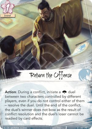 The strength of a card like Policy Debate lies not in its Duel effect but in the fact that it can be played multiple times in a single Conflict to look into your opponent’s hand and remove a card of choice. Often, opponents will simply throw a Policy Debate on an otherwise already decided Conflict simply to gain a parity advantage of maintaining card equity (1 card spent for 1 card discarded) as well as a strategic advantage of knowing what is in your opponent’s hand. This has only grown worse with the release of Return the Offense, a 1 Fate Event which makes a player’s most powerful Character available to participate in another Conflict – all this on a 1 Influence Crane Event.