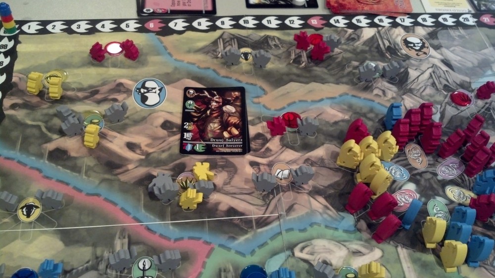You’ll then by able to deploy those supporters throughout the various kingdoms, in order to secure the loyalty of the various guild factions within those kingdoms. Taking control of one such guild house gets you some previous VP, but they also allow you access to guild-specific cards for your deck, as well as a Clan Lord for the teddy bear picnic dragon summit going on in the center.